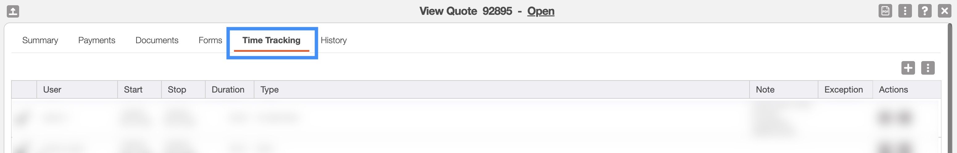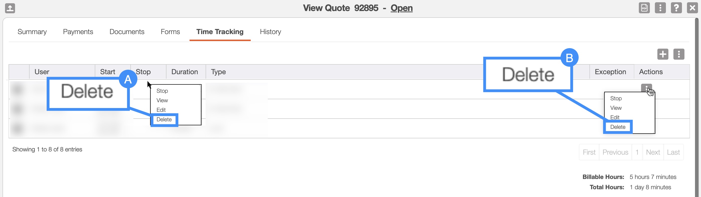 All the hours associated with the quote will be displayed in the "Time Tracking" tab. To delete the user's time tracking you can: