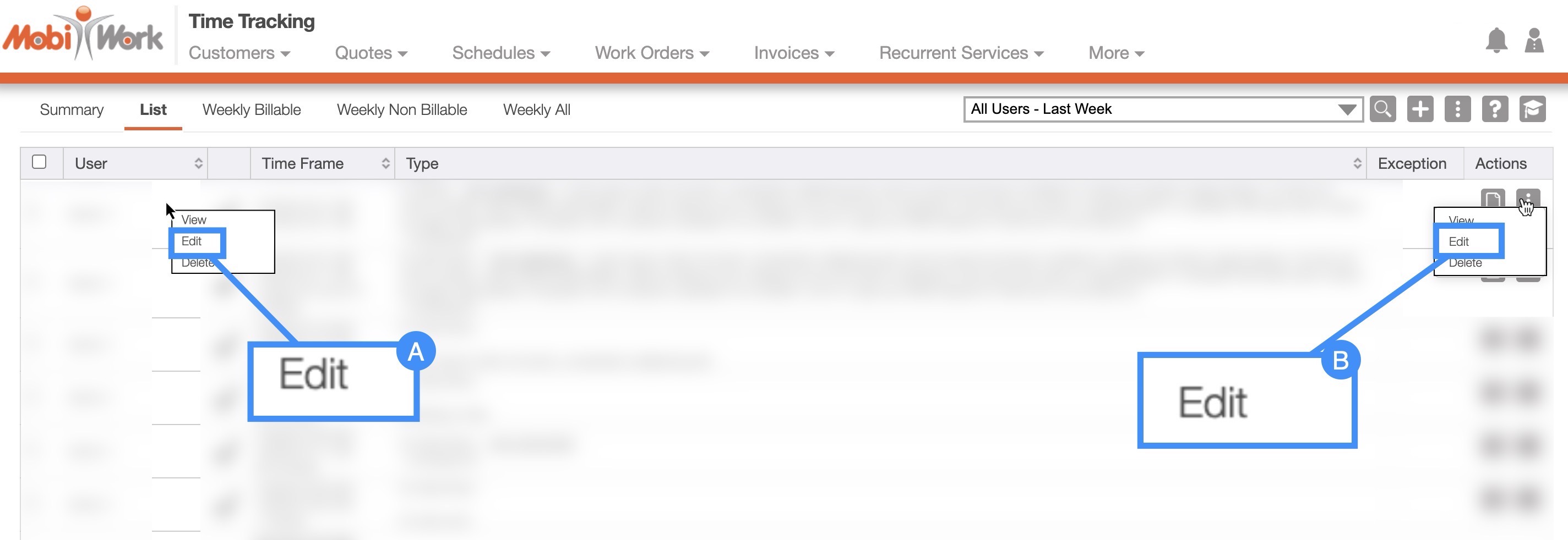 With MobiWork you can easily update your users' time tracking; this section will highlight the different ways you can access the Edit Time Tracking pop-up window and what you can update in this window.
