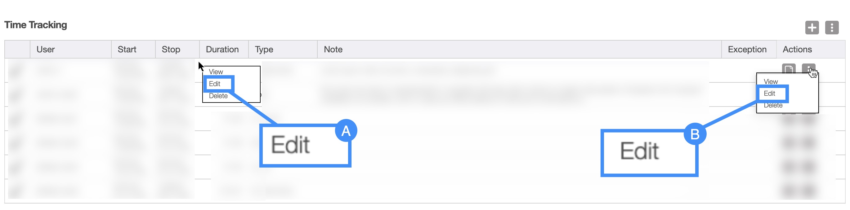 You can edit the time tracking for a selected user by accessing the View Time Tracking Entries pop-up window. For more information on how to access this pop-up window, please see the View Time Tracking page.
