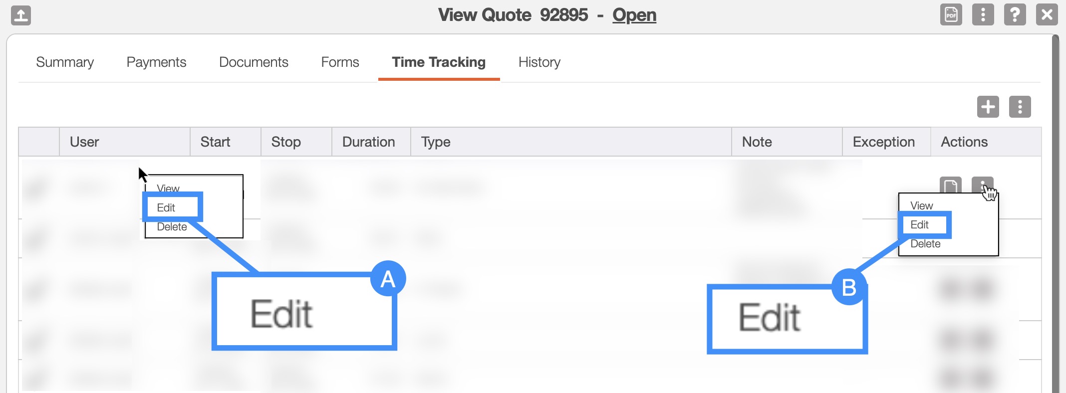 Another way you can access the Edit Time Tracking pop-up window is through the View Quote pop-up window. For more information on how to access the View Quote pop-up window please see the View Quote page.