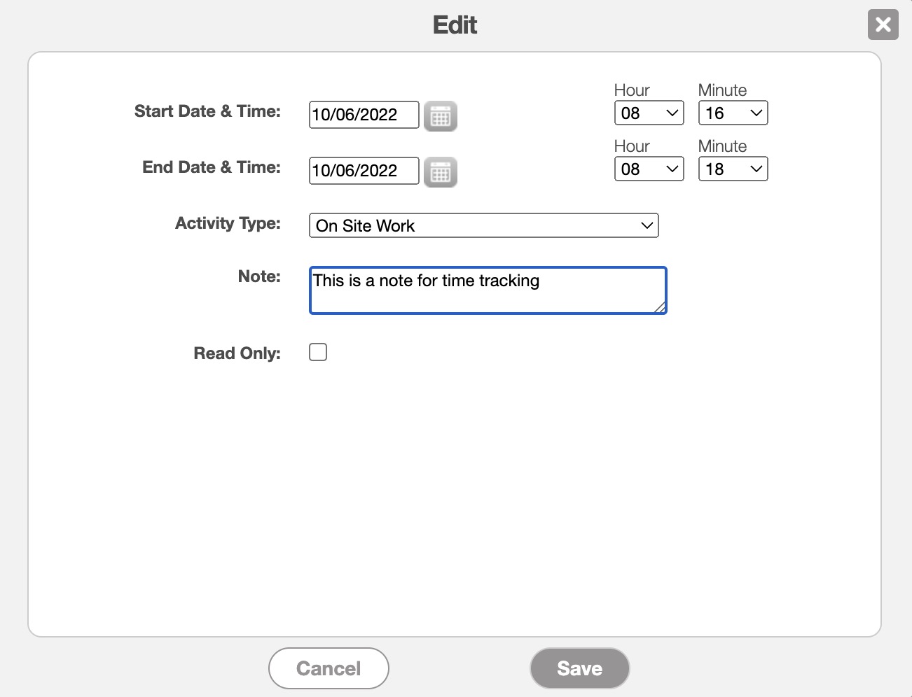 If you would like the time tracking event to be read-only (i.e., no further changes or edits can be made) mark off the "Read-Only" checkbox.