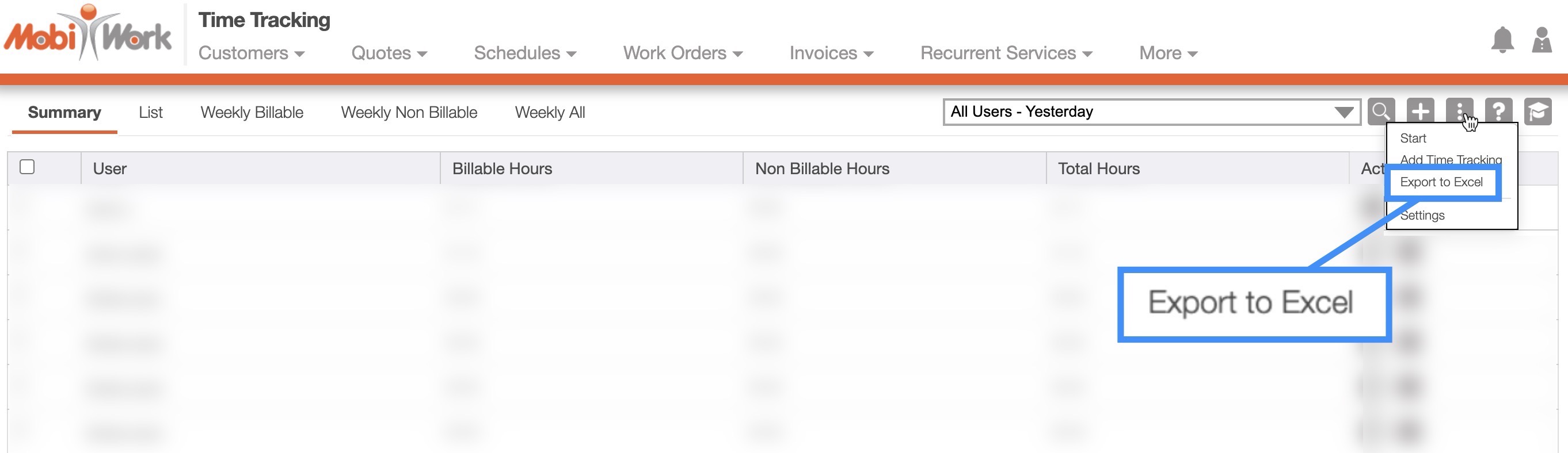 To export your users' time tracking data into an Excel document, you will first need to access the Time Tracking feature page. Once you click on the More Actions button, select the "Export to Excel" option from the drop-down: