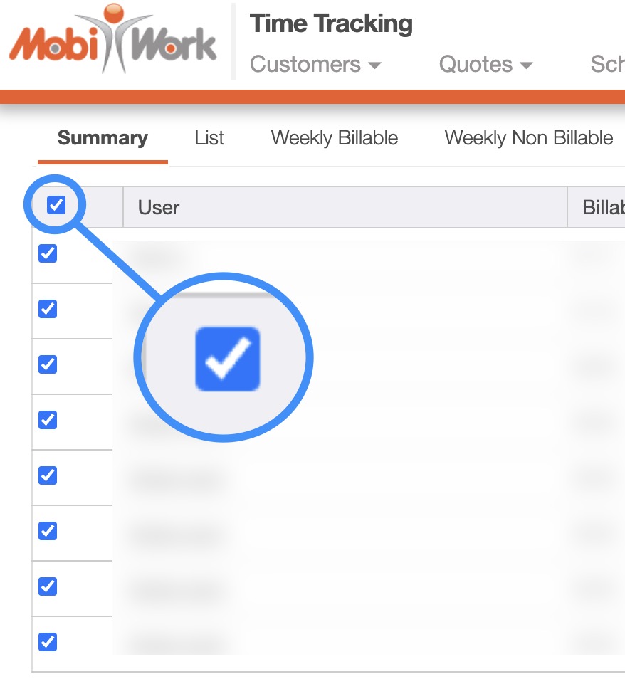- Please note that if you would like to export all your users' time tracking data into Excel you can click on the topmost checkbox (Multiple Selection Area). Likewise, if you do not select any entries ALL records will be exported:
