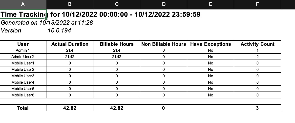 The Excel download will display the user, time duration, the billable hours, the non-billable hours, any exceptions, and the activity count (i.e., time entries associated with the user):
