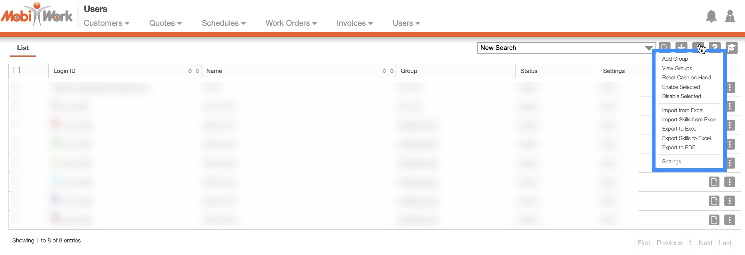 | "Import from Excel" | Imports users from Excel into MobiWork. |