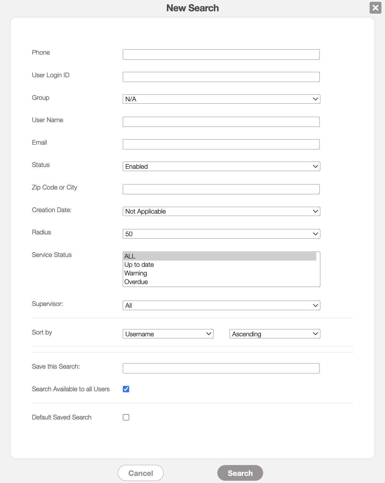 | "Sort by" | Sorts your search in ascending or descending order by: Username, Created Date, Login ID, or Supervisor. |