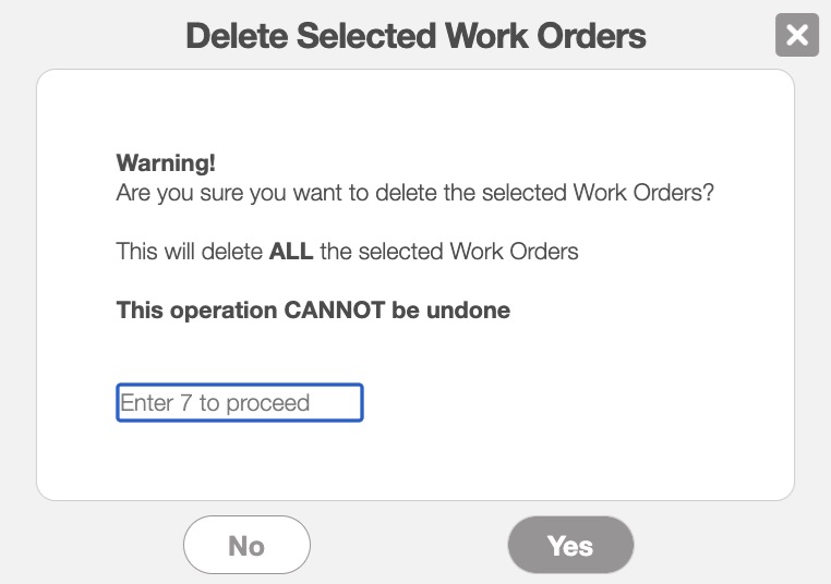 Enter the specified number and then click the Yes button to confirm deletion. Once confirmed, the work orders will automatically be deleted from MobiWork.