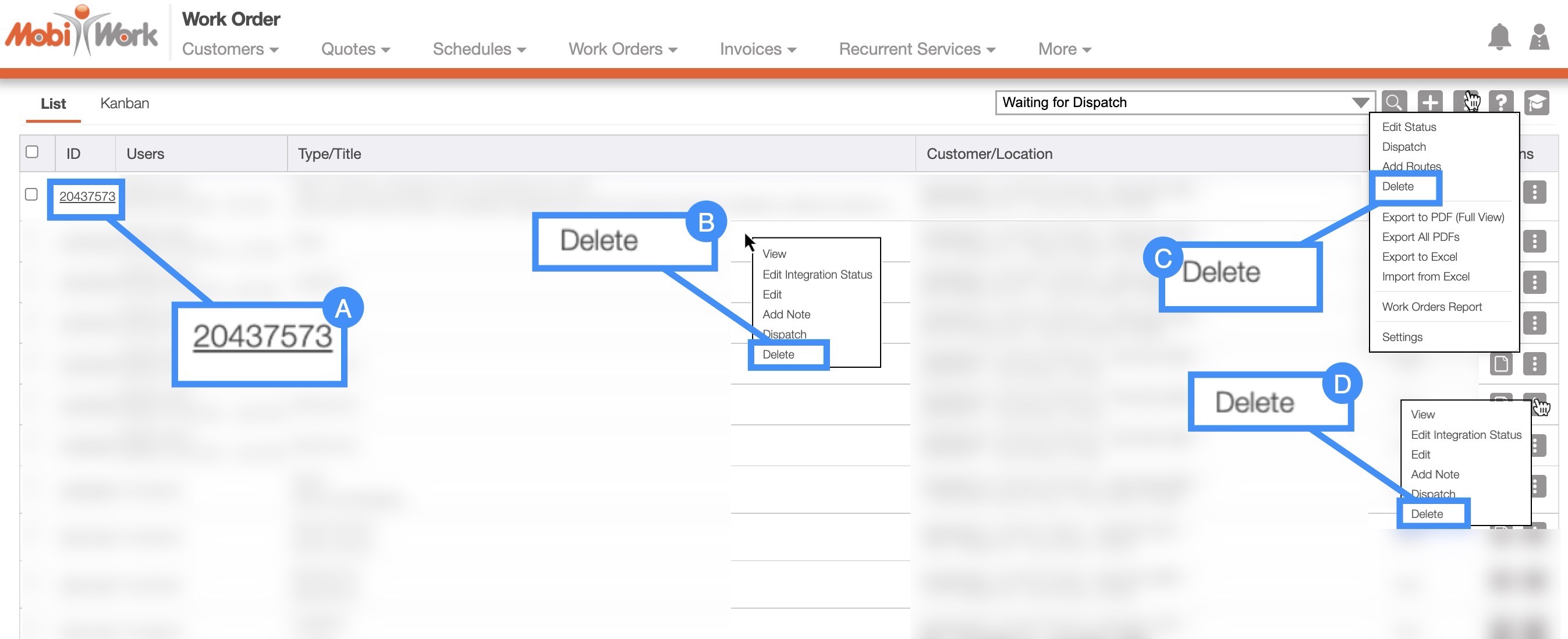 Once, you are on the Work Order "List" tab, there are several different ways you can delete a work order: