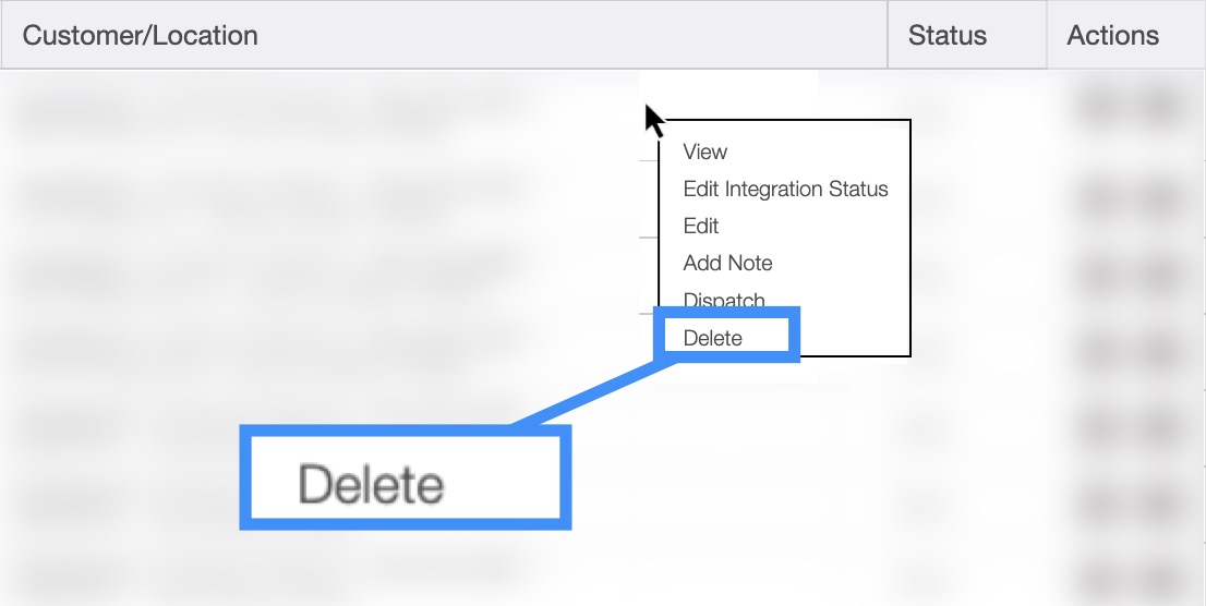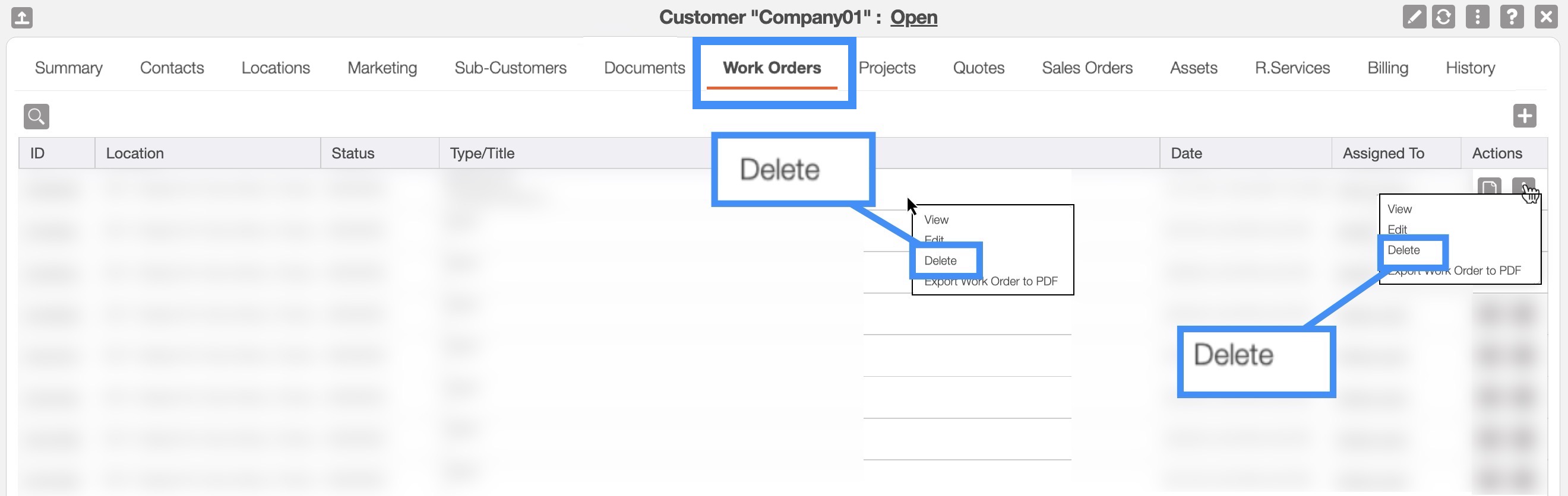 Once you open the View Customer pop-up window select the "Work Order" tab. On the "Work Order" tab click on the Individual Actions button or right-click on the desired work order, and from the drop-down select the "Delete" option: