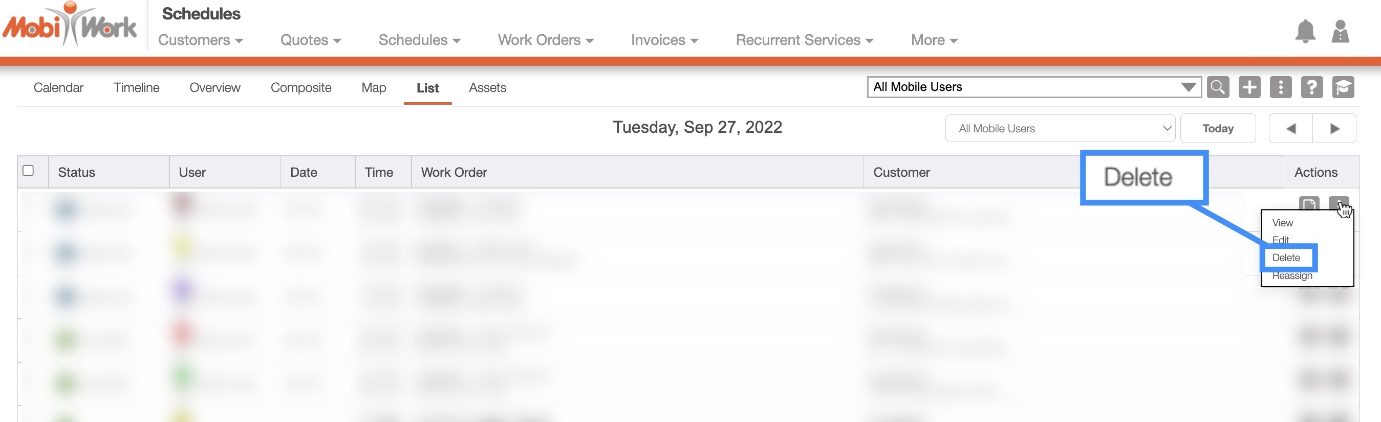 There are several ways you can delete a work order within MobiWork. You can delete the work order through the Work Order "List" tab, going through the "Work Order" tab in the View Customers pop-up window, through the Customers feature, or through the "List" tab.