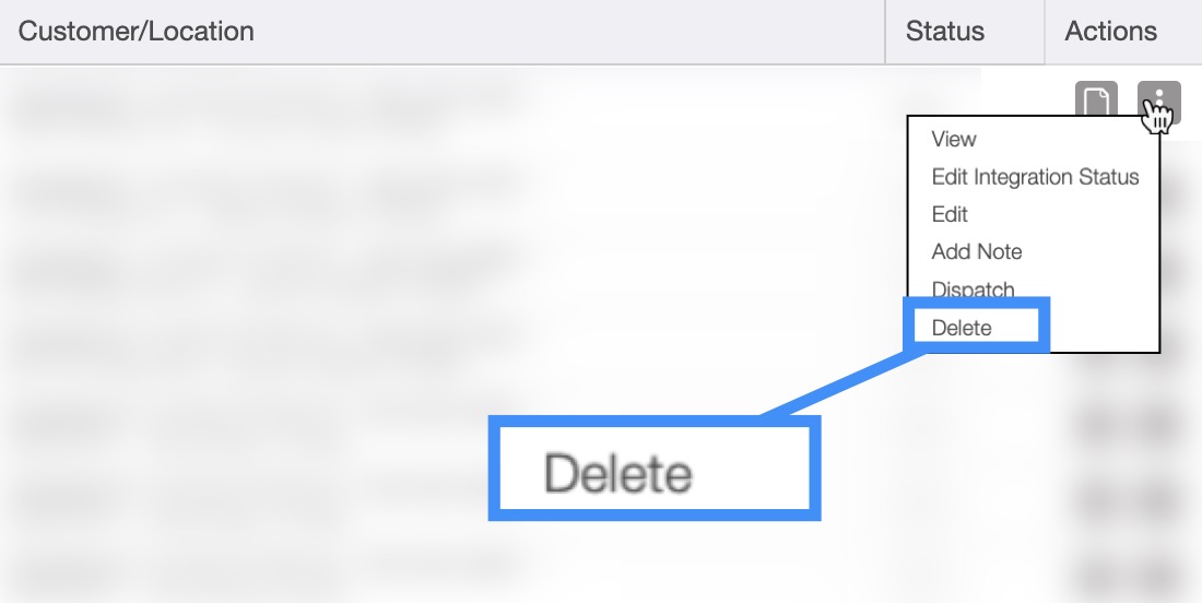 Clicking on the Individual Actions (from the Work Order "List" tab or Schedule "List" tab) and selecting the "Delete" option from the drop-down: