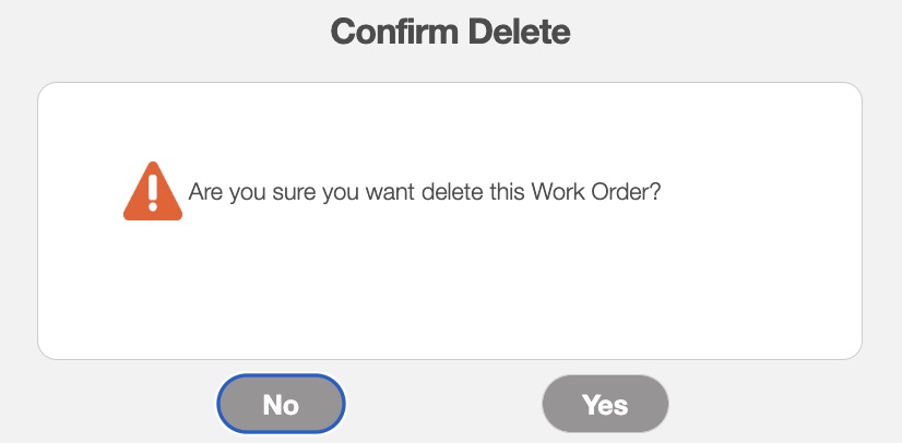 Regardless of how you choose to delete a work order, a warning pop-up will appear asking to confirm if you would like to delete this work order, and informing you that the deletion of a work order is permanent: