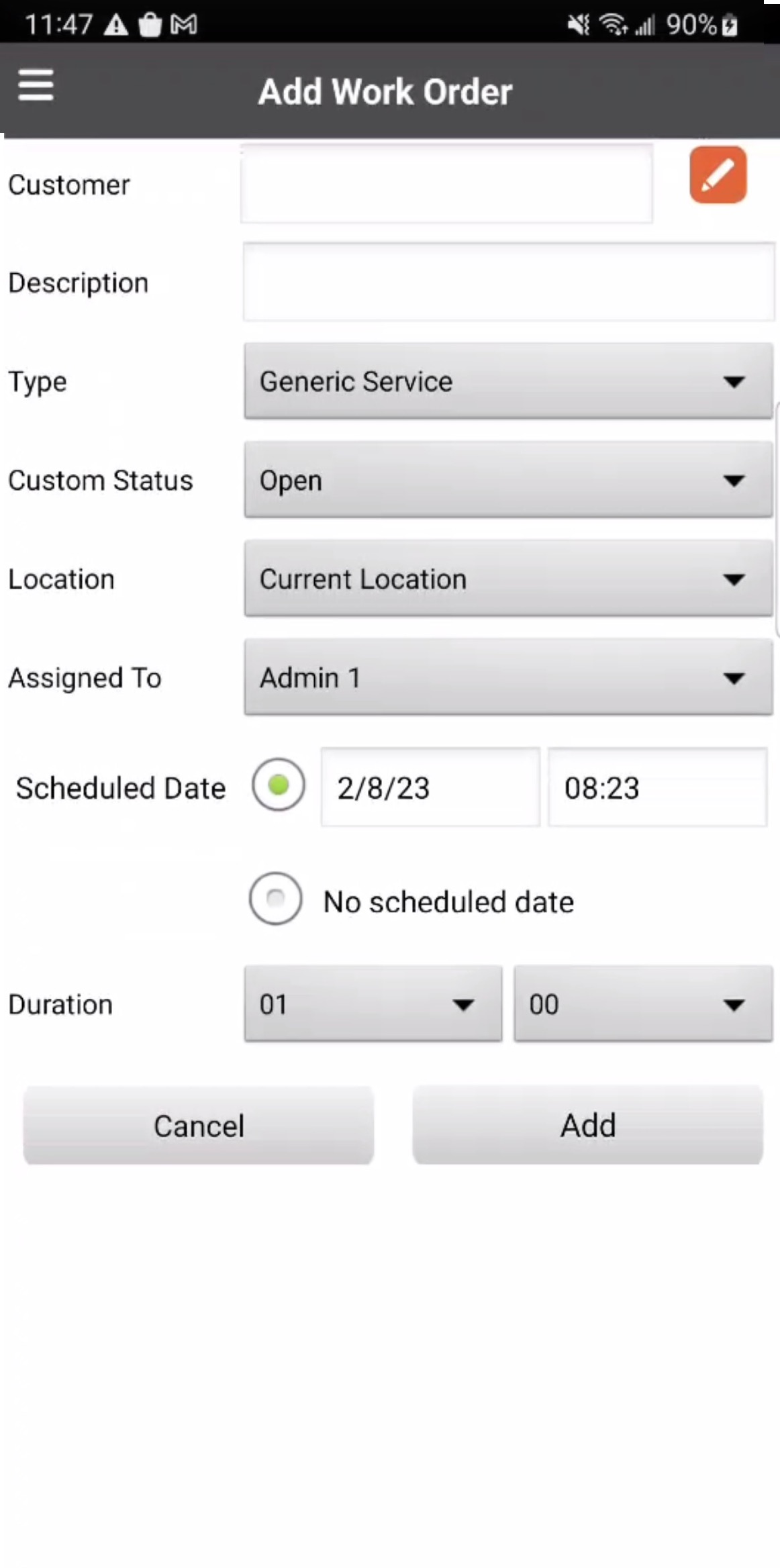 The customer the work order is intended for. By pressing the Pencil button, you will be able to see all the customers associated with your company, search for specific customers, or add a new customer. For more information about customers, please see the Customers page.