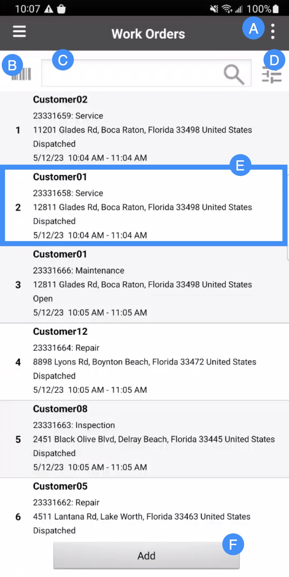 The assigned work order will be listed here along with a description of the work order, the date/time the work order is assigned for, the customer's name, etc.