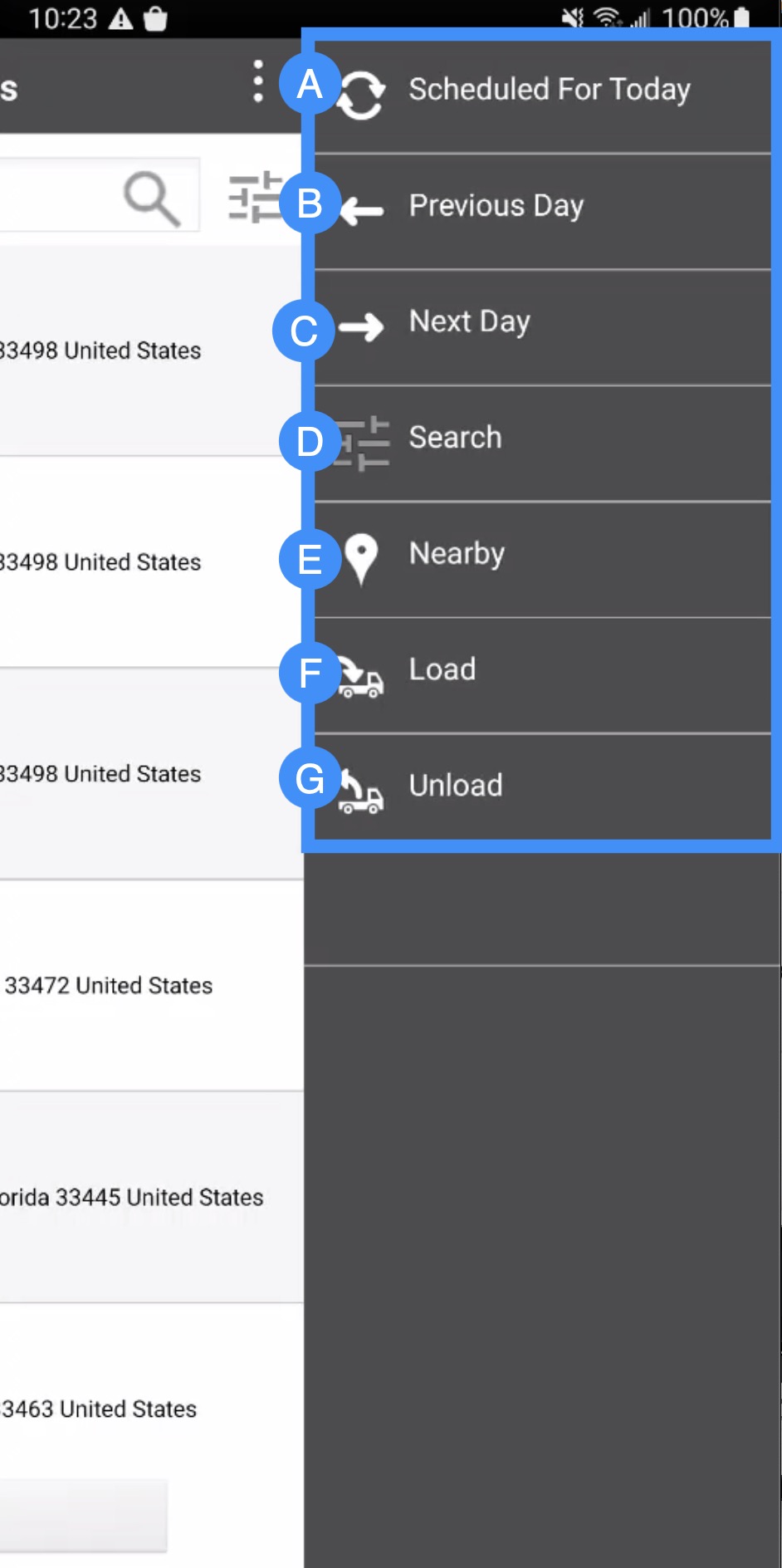 The Actions Panel which will allow you to access the additional functions (e.g., assigned work orders for the previous and next day, load/unload features, etc.)