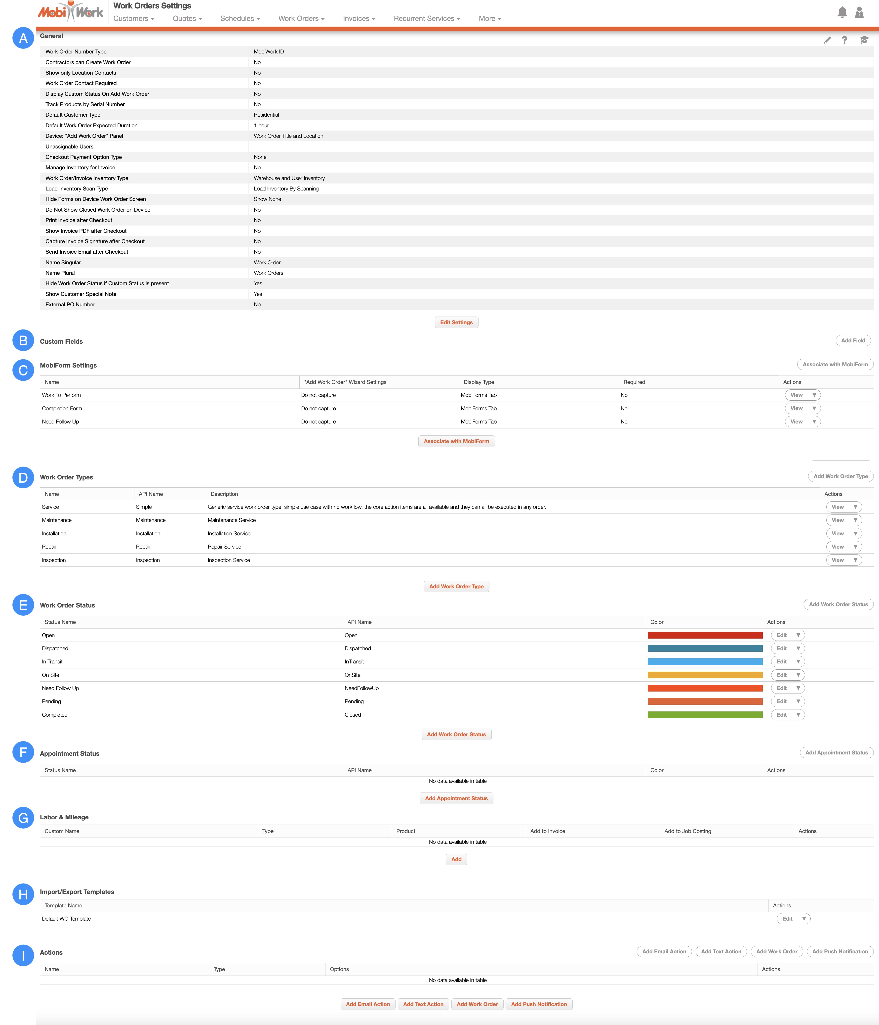 Once you are on the Work Order Settings page there will be a number of different sections:
