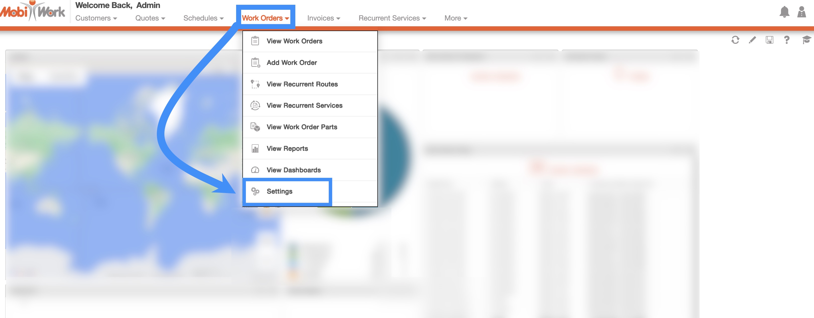 You can directly access the Settings page, by hovering over the Work Orders feature from your MobiWork menu, and clicking on the "Settings" option: