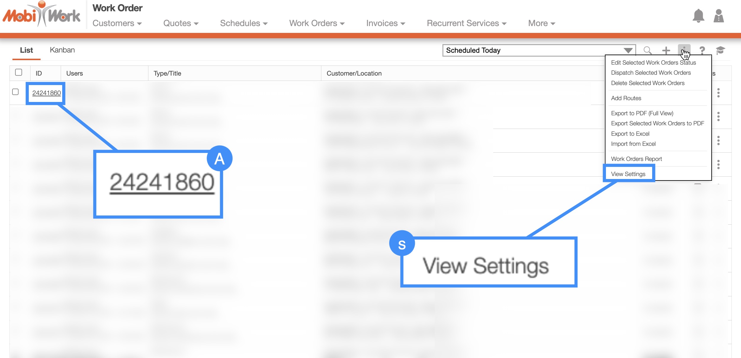 By clicking on the More Actions button located at the top-right of the Work Orders feature page, and from the drop-down selecting the "View Settings" option.