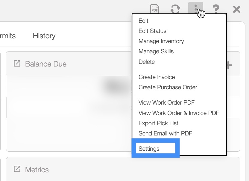While you are on the Work Orders List page you can click on the More Actions button located at the top-right of your MobiWork web interface, and from the drop-down select the "Settings" option: