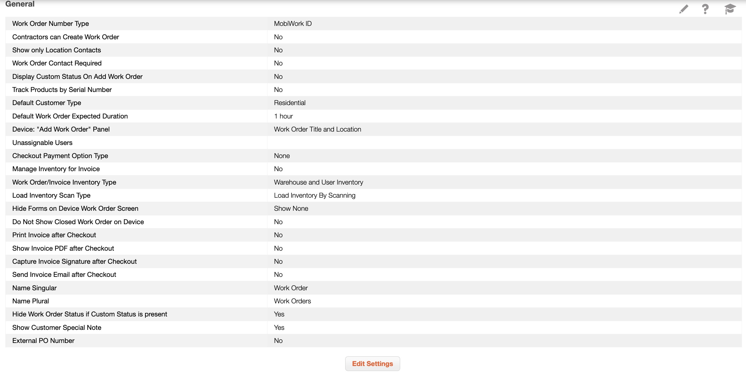 The General Section will display how the work orders are organized in MobiWork, invoice options, inventory options, etc.: