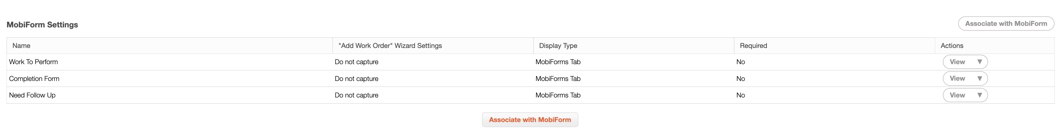 | "Associate with MobiForm" | will display the MobiForm inside a type or all types of work order's MobiForms tab or summary panel. |