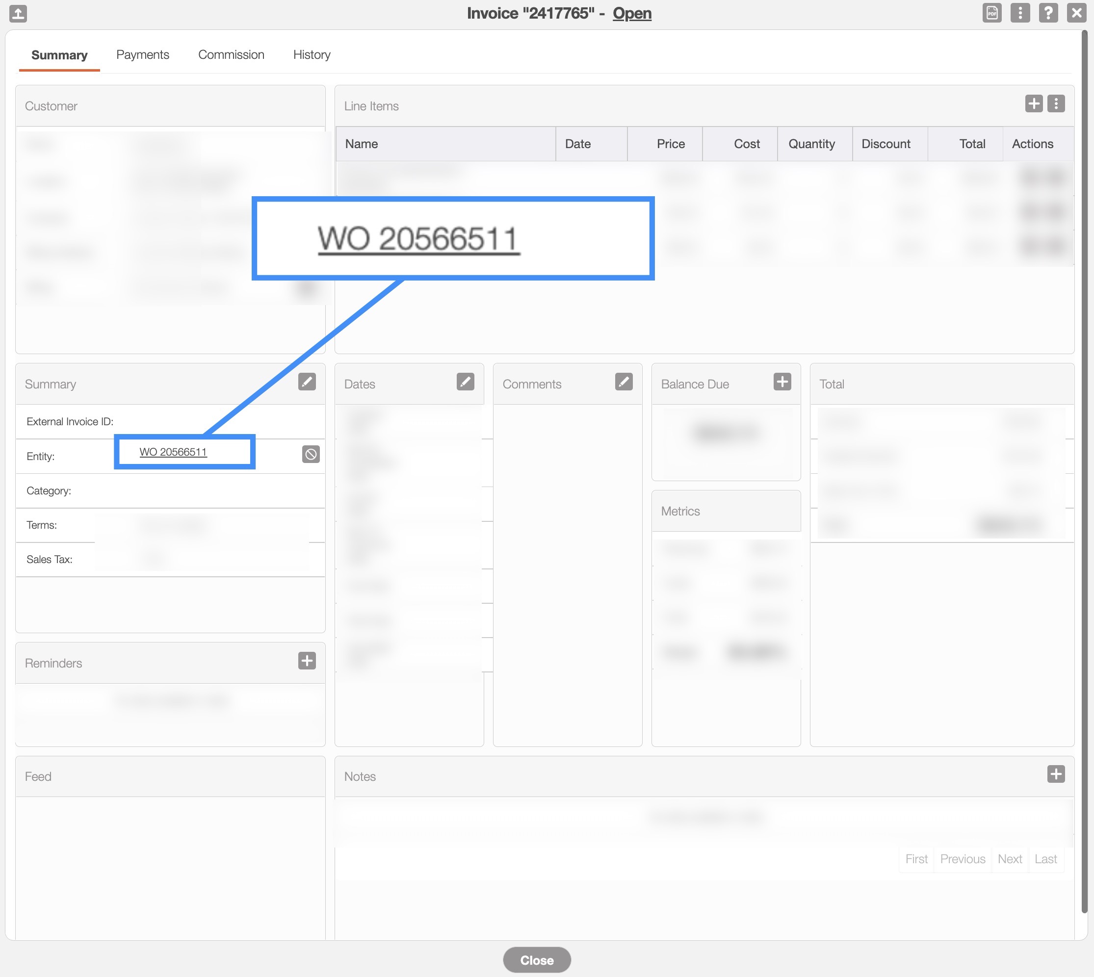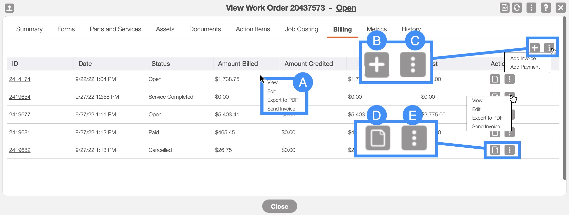 The "Billing" tab will display all the invoices associated with the work order regardless of the invoice status: