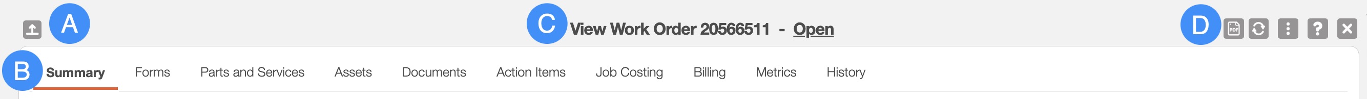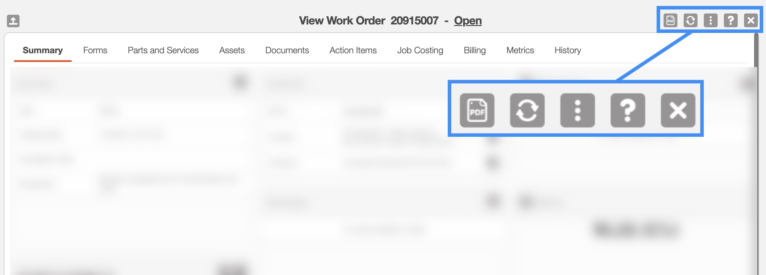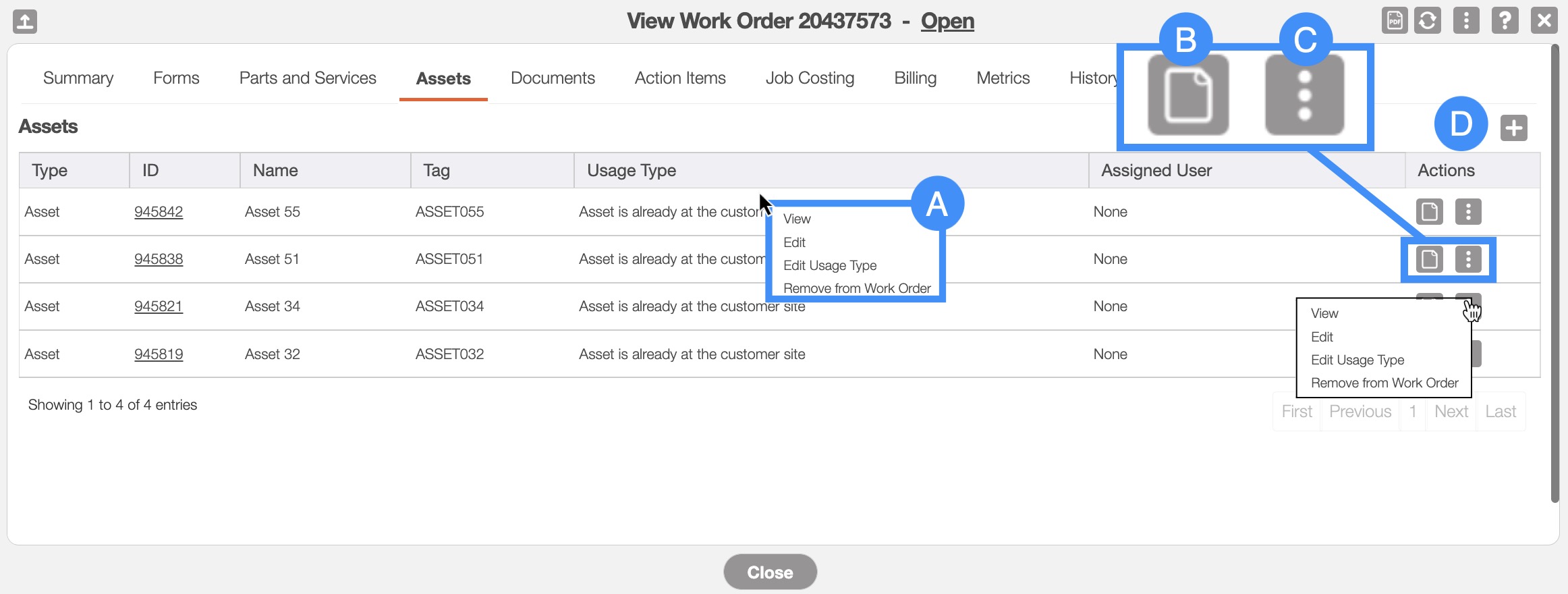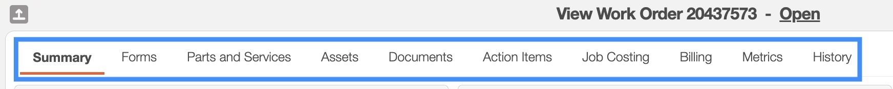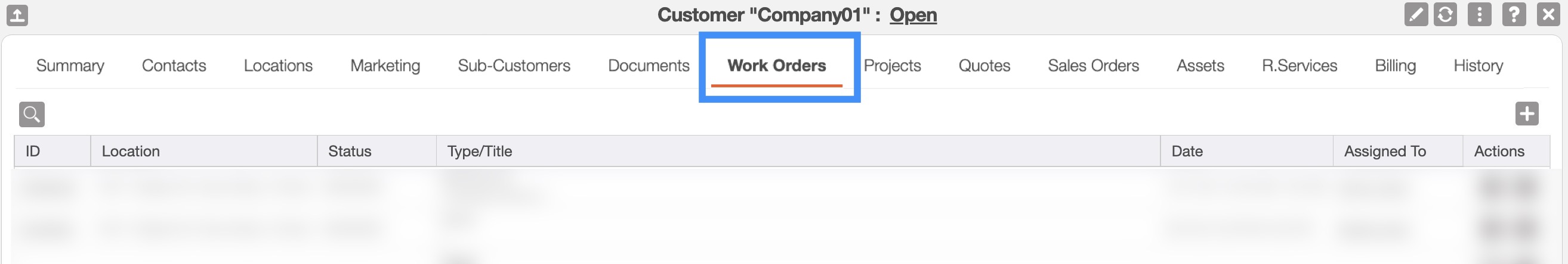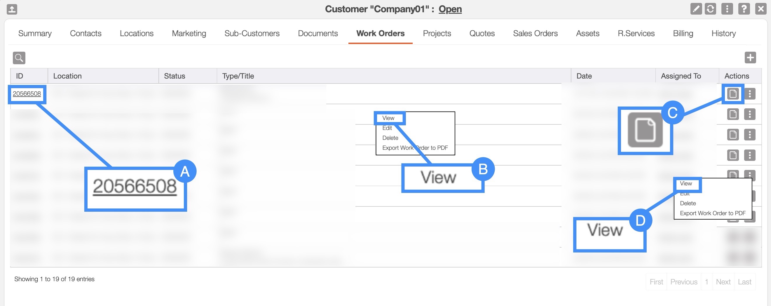 All the work orders associated with the customer will be displayed on this tab. To access an individual work order and open its View Work Order pop-up window please see the following actions: