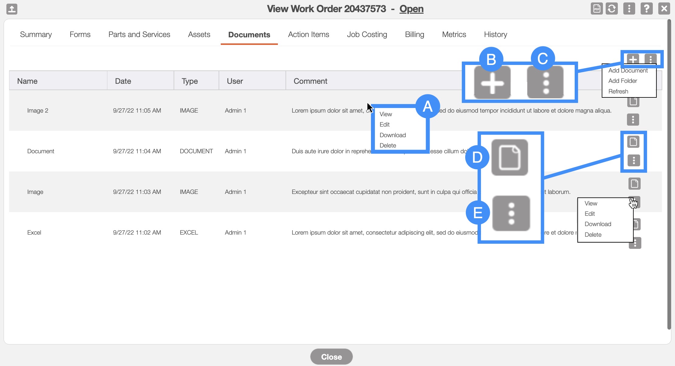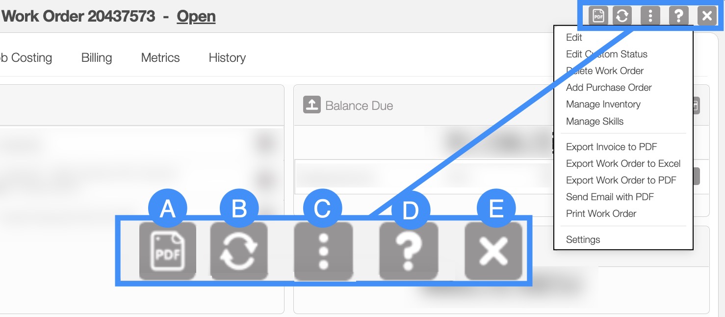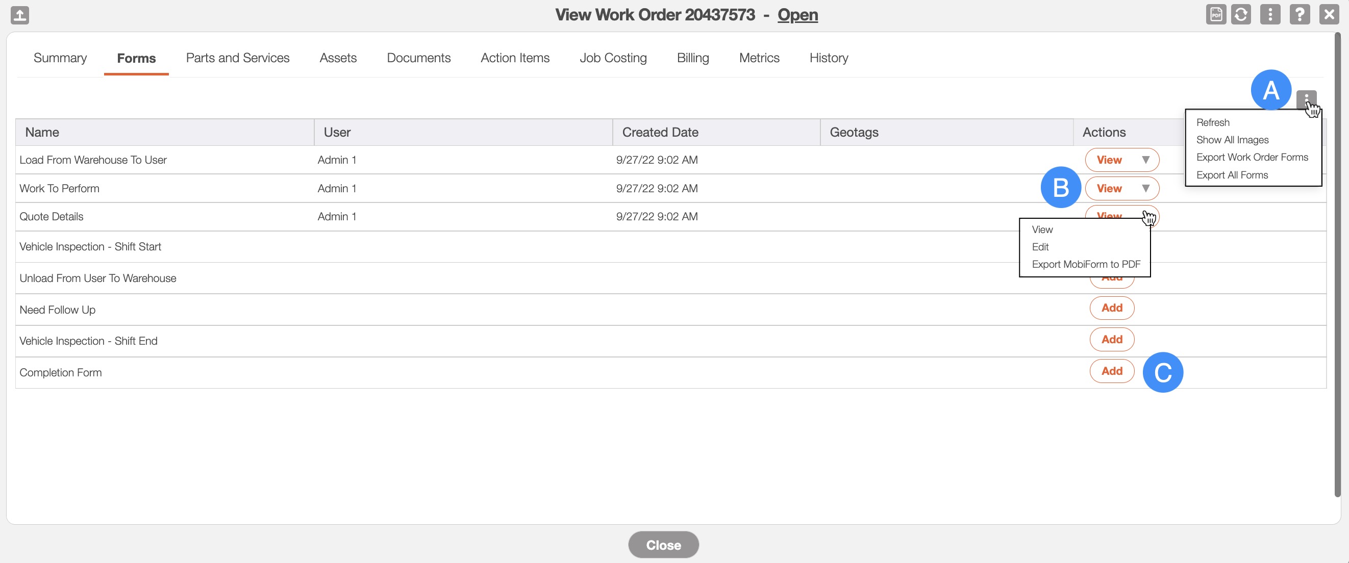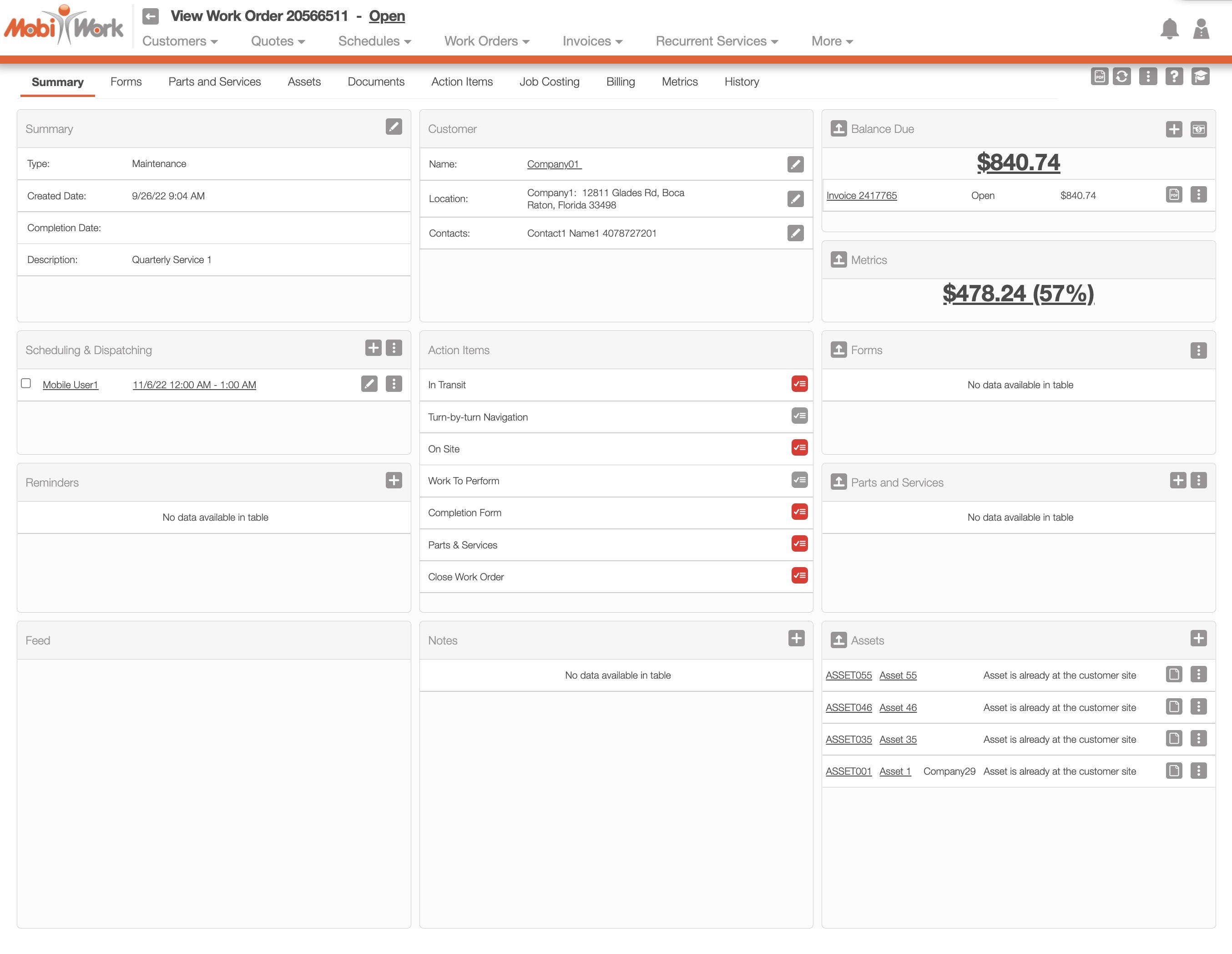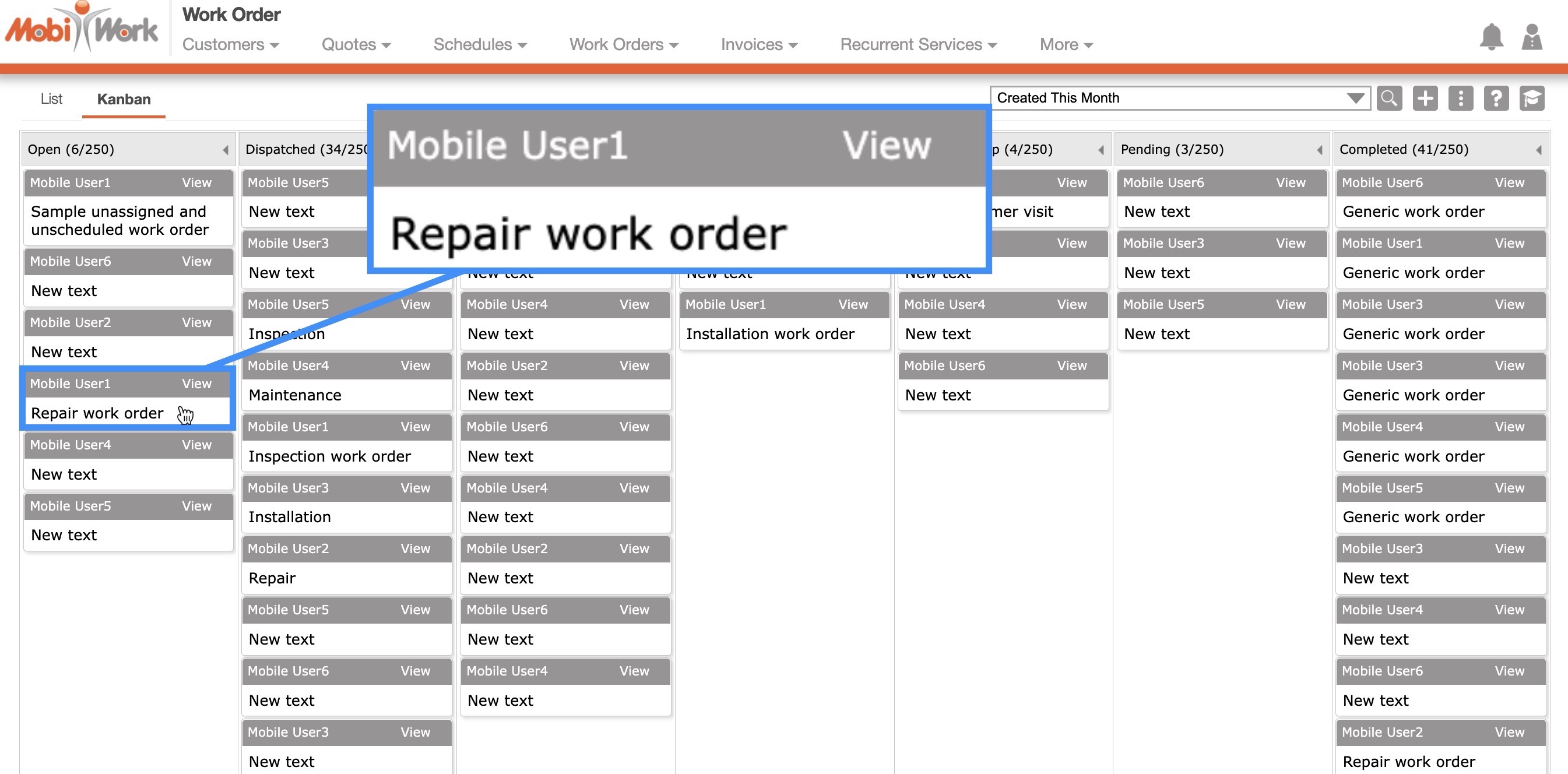 The following sections demonstrate some common methods of how to access the View Work Order pop-up window from your MobiWork web platform.