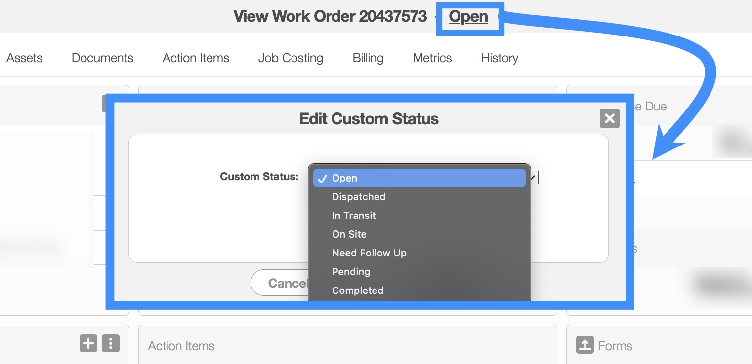 Upon Completion Change Custom Status to- Once the new action item is activated it will change the custom status of the work order.