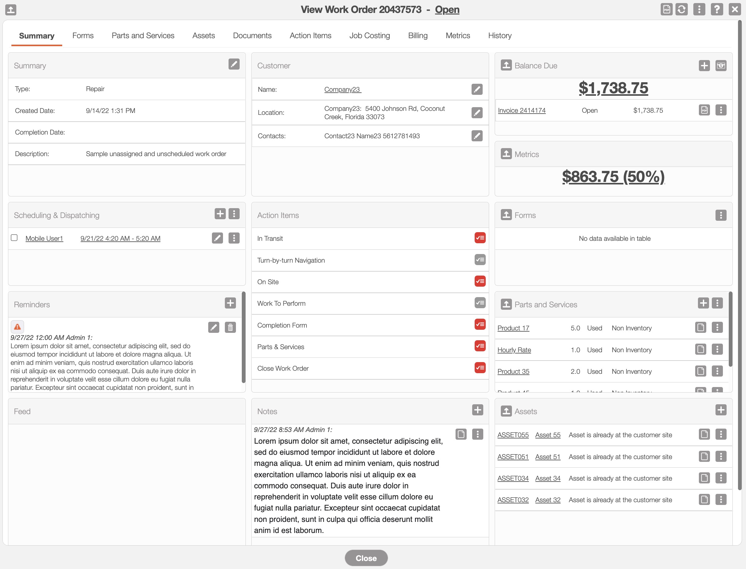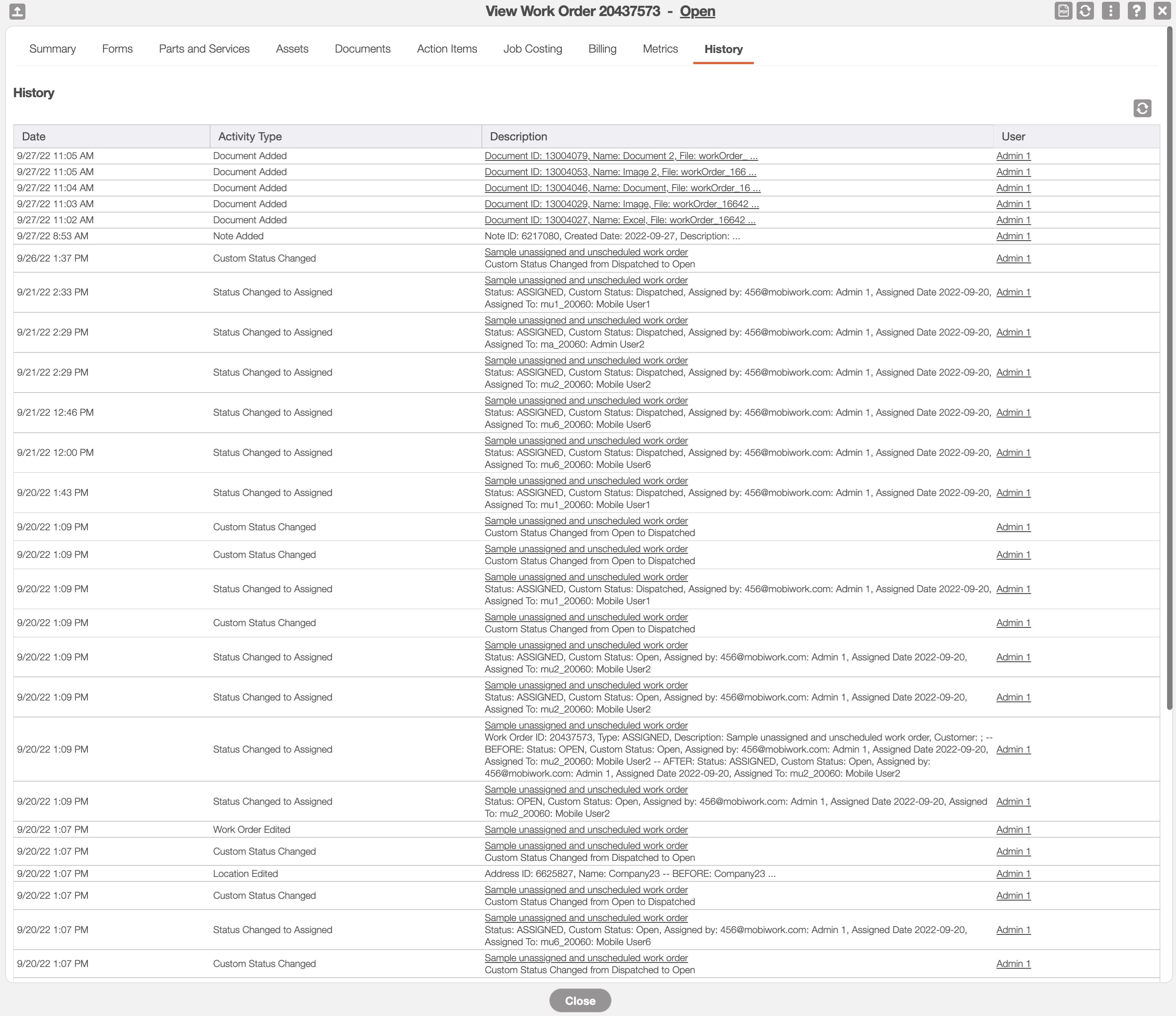 The View Work Order pop-up window has all the information you need regarding your work orders; in this pop-up window you can access your users' time tracking records, customer location information, work order-related documents, and more.