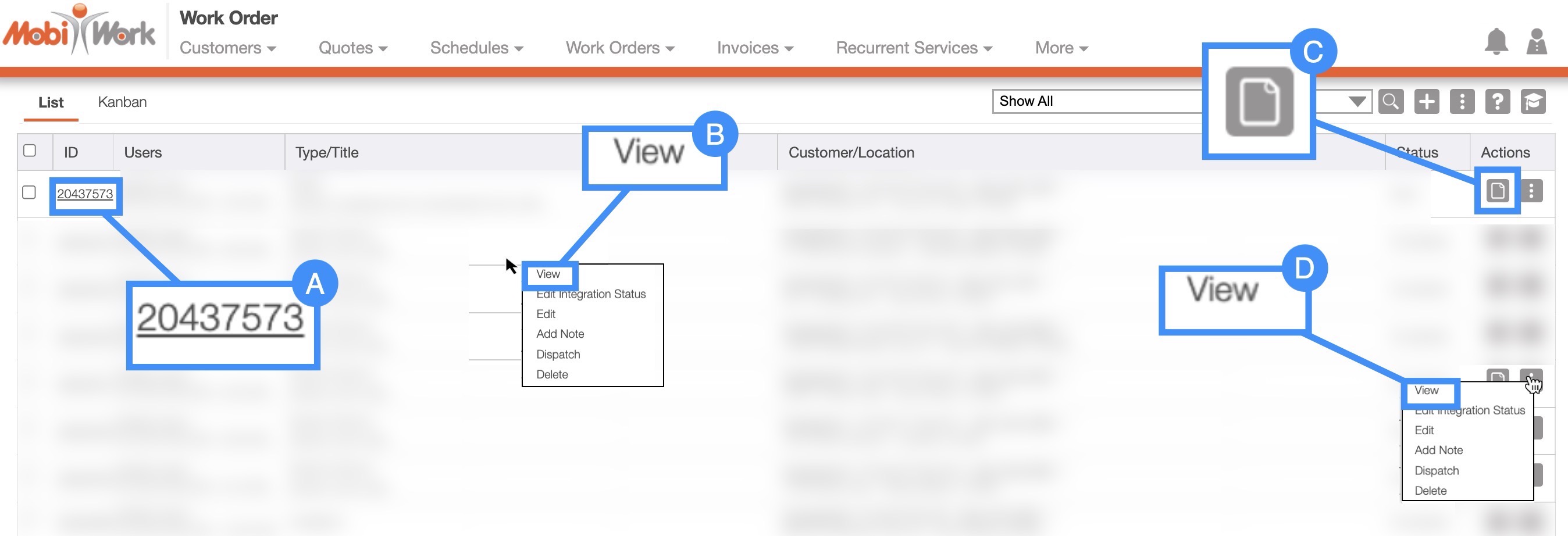 Once you are on the "List" tab, there are four different ways to access the View Work Order pop-up window:
