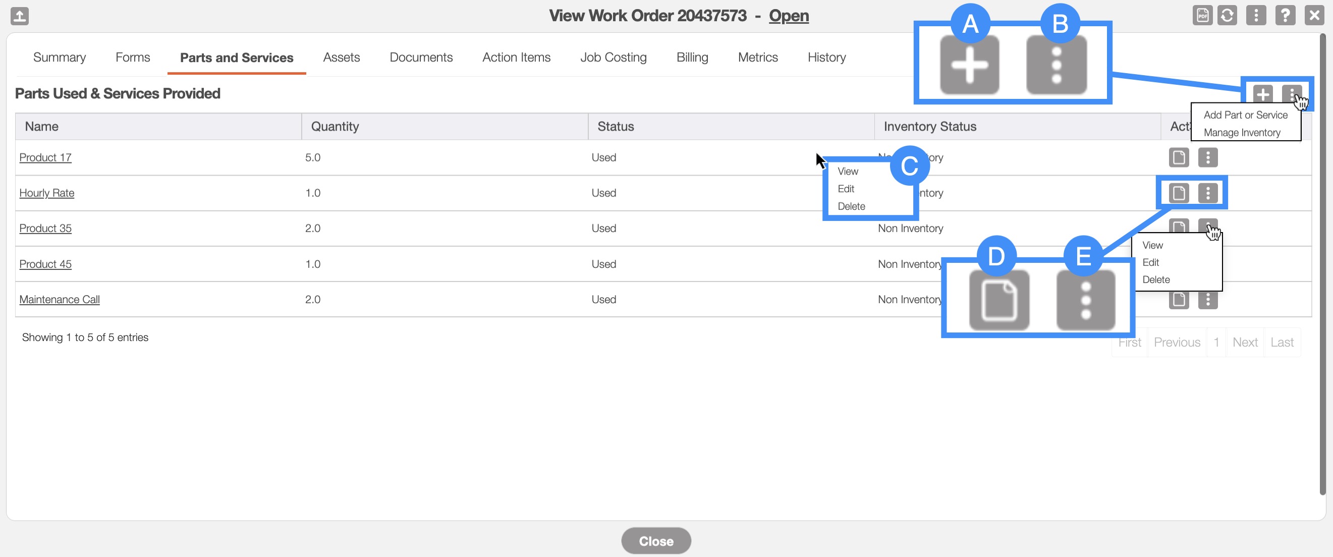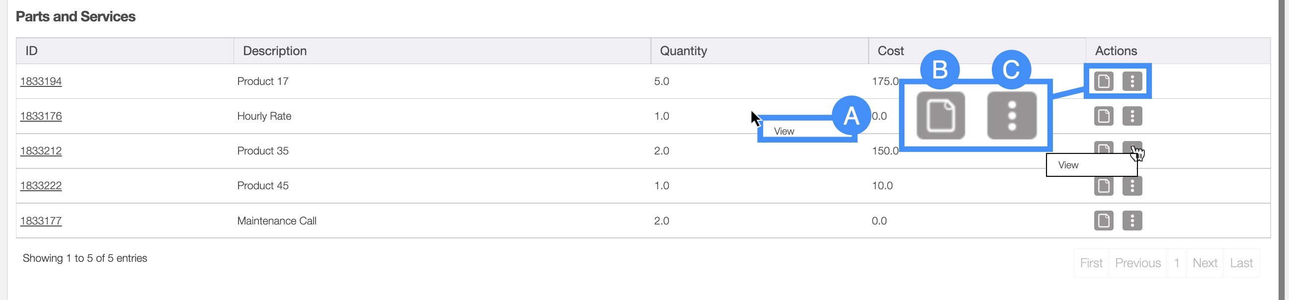| "Actions" | Allows you to view the parts or services in a read-only format. |