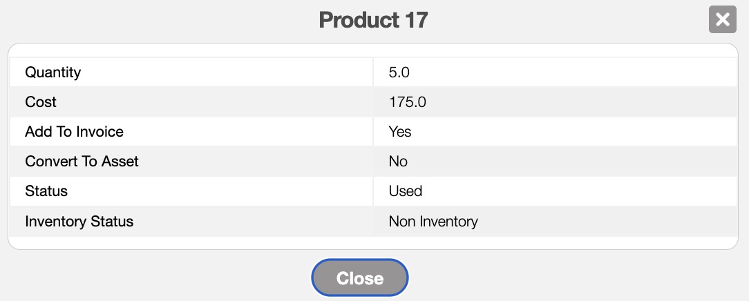 The "Parts and Services" section will detail the parts and services that are used in the work order. Please note that you will be unable to modify the items that appear in this section: