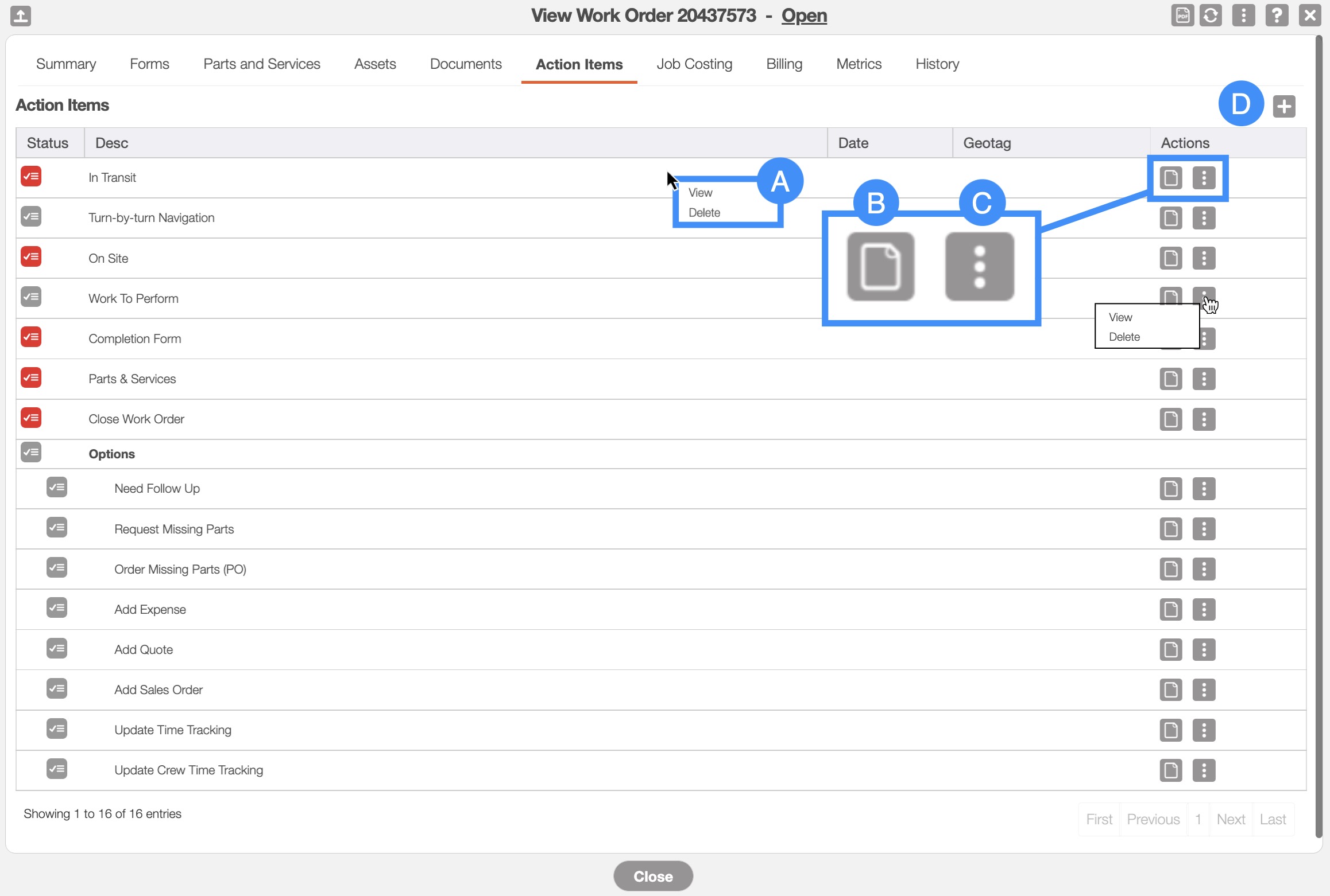 The Individual Actions (the three dots next to the View icon) are identical to the right-click actions and will allow you to view or delete the desired action item.