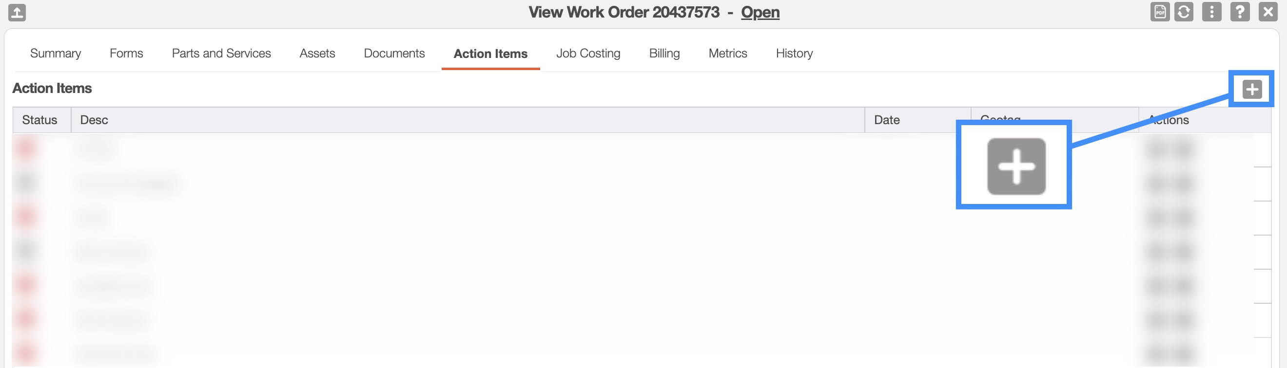 The Plus Sign will add a new action item. The subsection, "Add a New Action Item" will go into more detail regarding the process of adding a new action item for your user to complete on their work order.