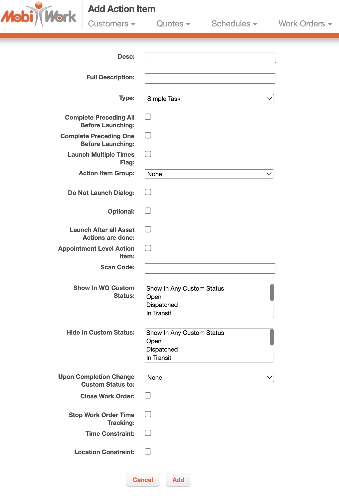 Desc- Enter the description for the new action item; this will also serve as the name of the new action item.