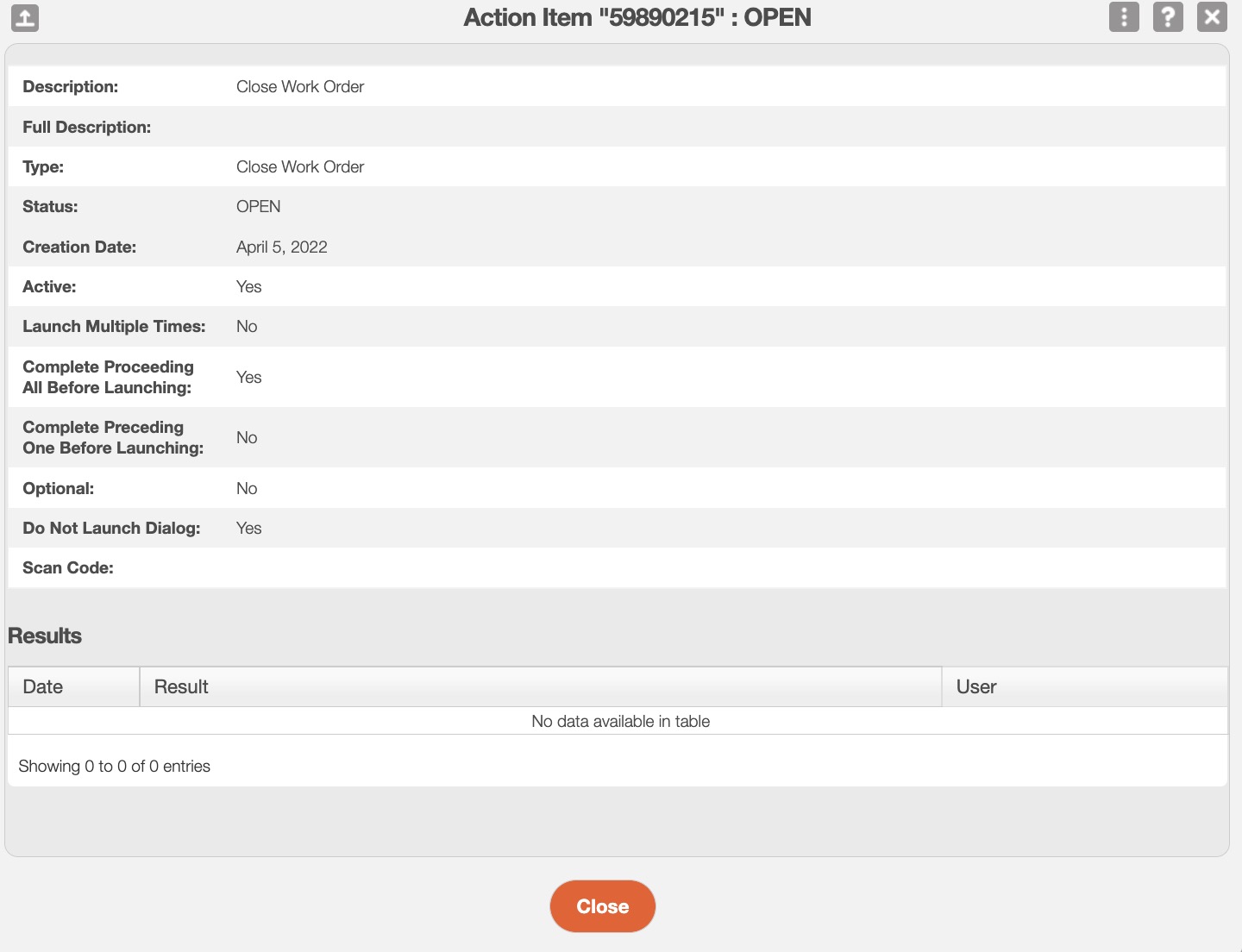 Close Work Order- Once the new action item is activated, it will close the work order.