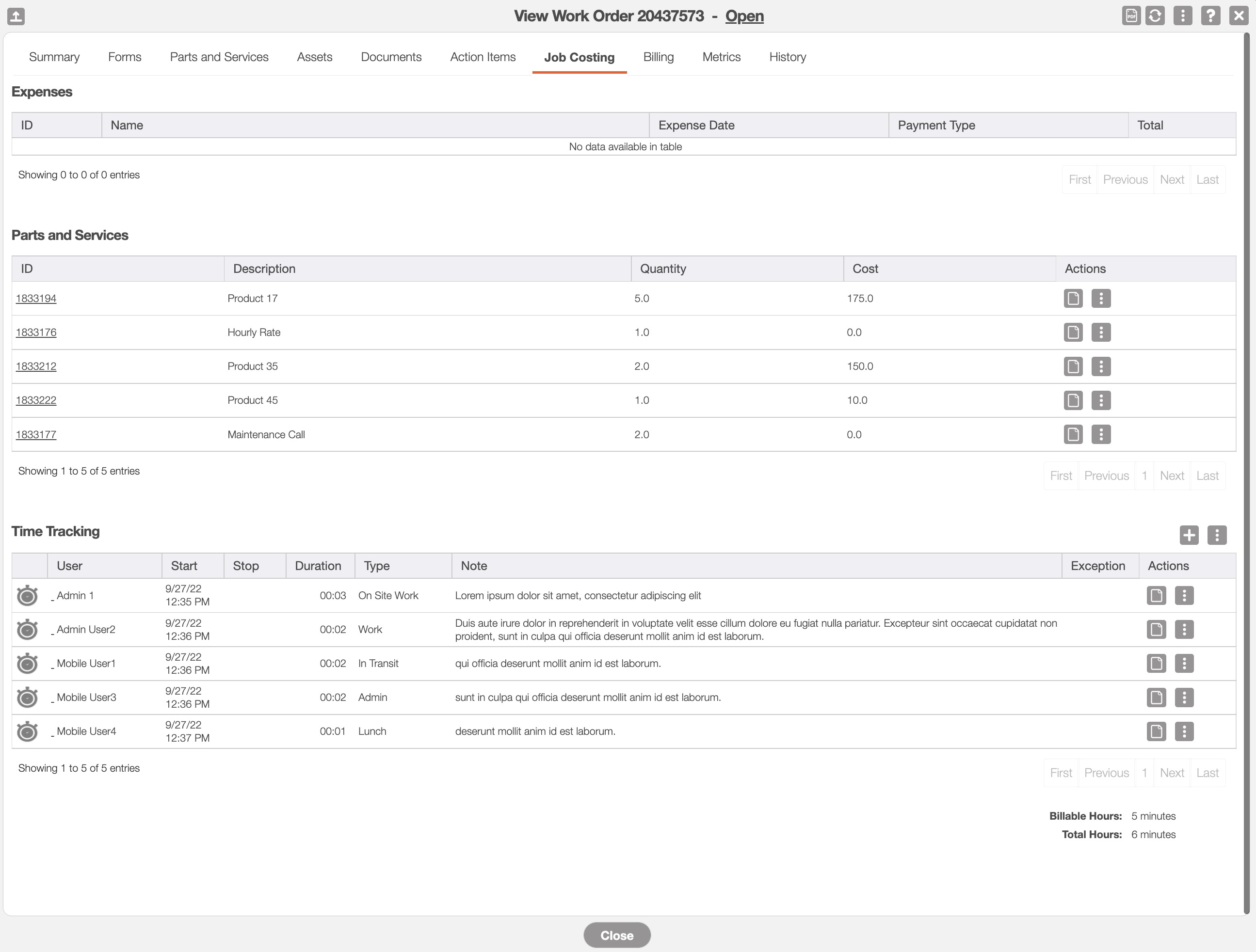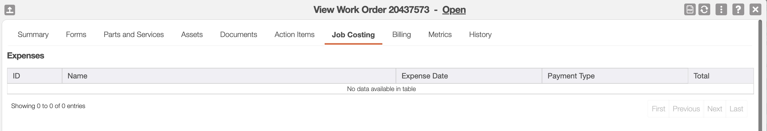 The "Job Costing" tab will list all the expenses (e.g., the time a user spent on a work order, the cost of parts and services used on a work order, etc.)