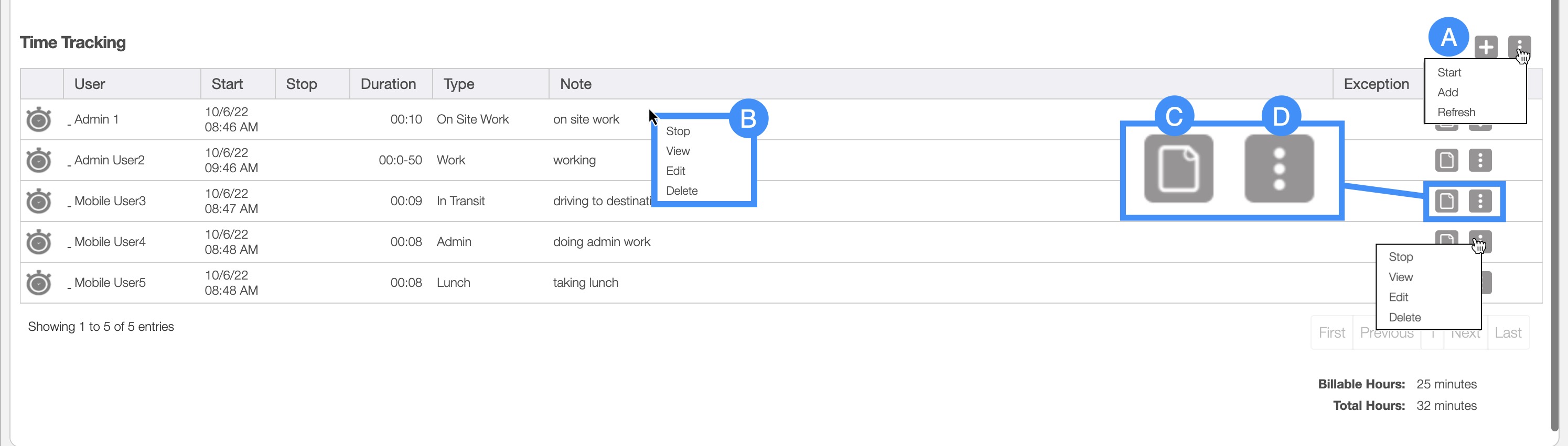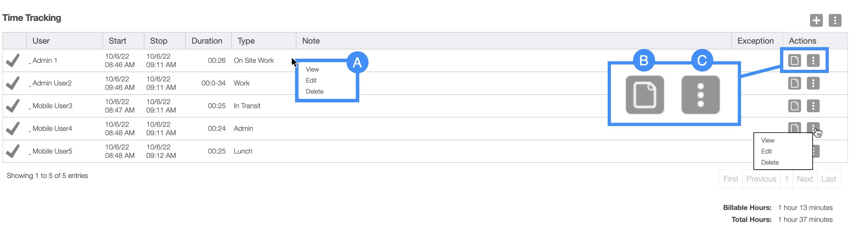 The Individual Actions for a stopped time interval (the three dots next to the View icon) are identical to the right-click actions for a stopped time interval and will allow you to view the hours in a read-only format, edit the time, or delete the time.