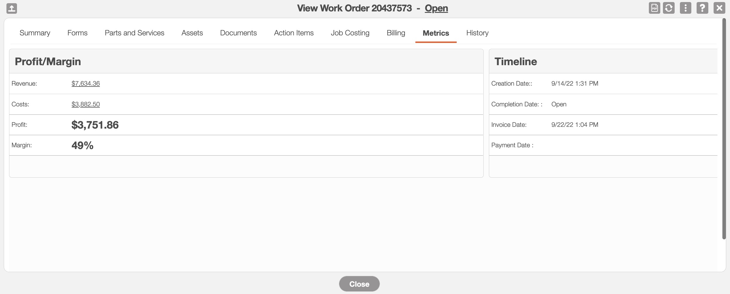 The "Metrics" tab will display the profit, revenue, costs, and margin associated with the work order: